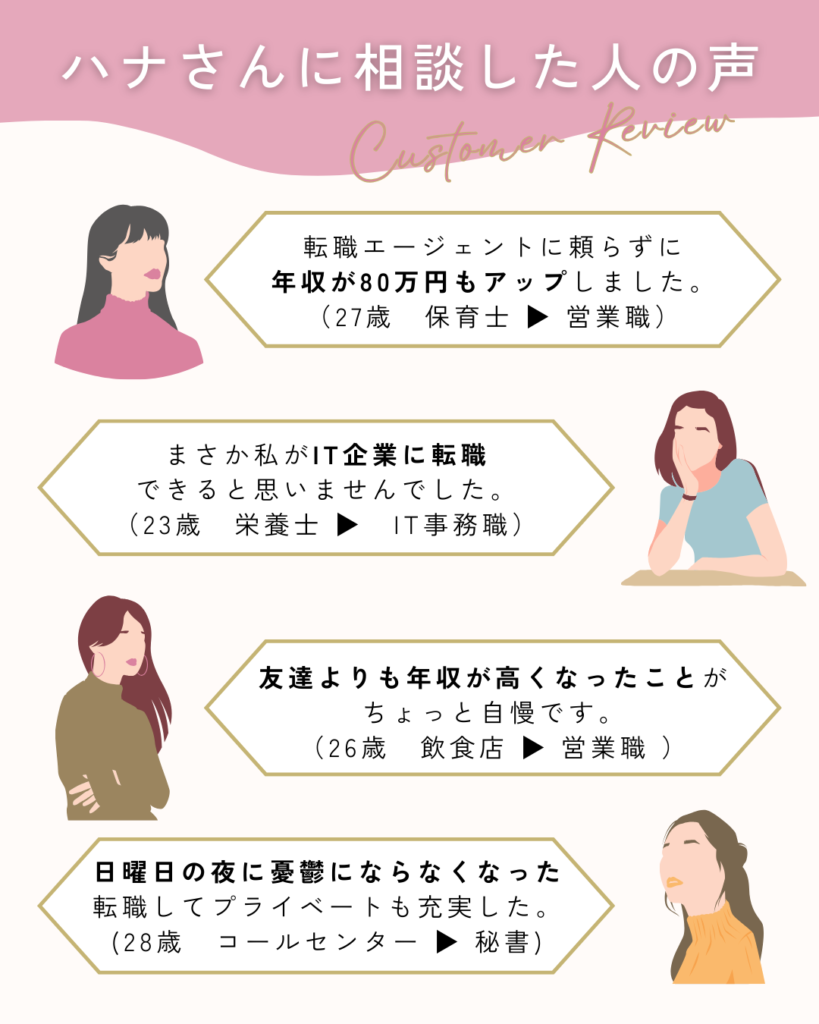- ハナさんのLINEでは、転職エージェントが教えない転職方法を教えてくれる